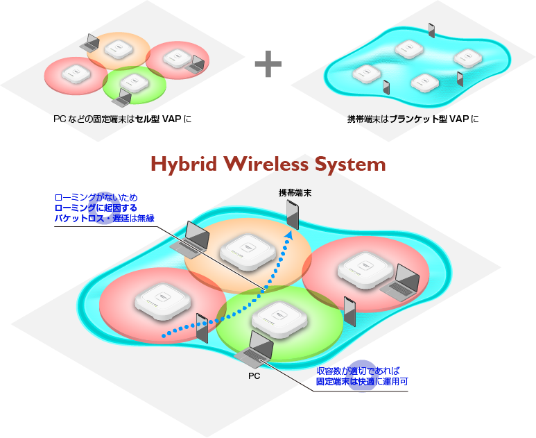 例えば、PCなど比較的移動が少なく高スループットの通信を行う固定端末をセル型VAPに、頻繁に移動を行い、かつスループットを重視しない移動端末をブランケット型VAPに収容することで、ネットワークをより効率的に運用できます。
