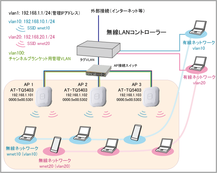 ここでは、無線1(2.4GHz)のVAP「0」でネットワーク「10」を、無線2(5GHz W52)のVAP「0」でネットワーク「20」を、それぞれチャンネルブランケット型で運用するものとします。