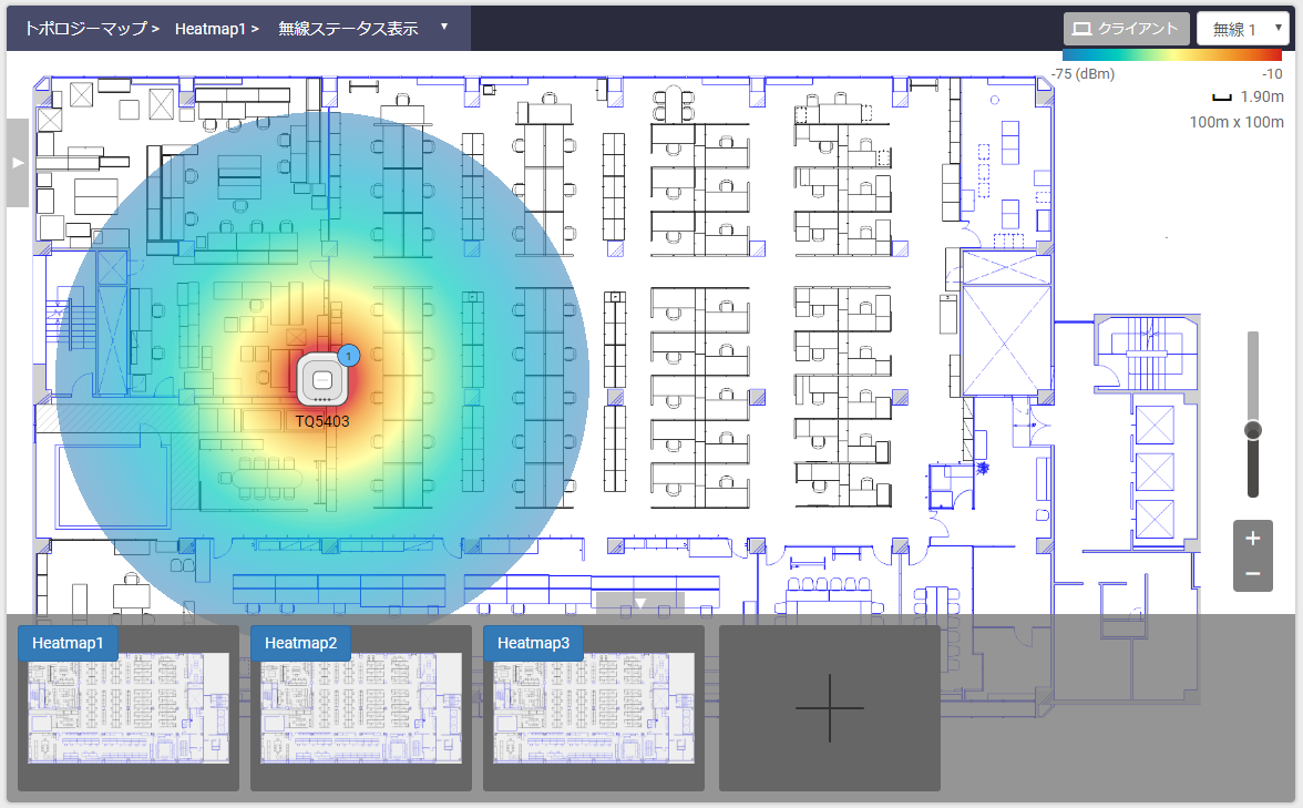 Note到達範囲と強度の表示はAPの無線送信出力設定から算出される見通しでの想定到達距離にもとづきます。設置場所の状況(遮蔽、反射など)は考慮されませんので、実際の到達範囲や強度、通信状態とは異なる場合があります。