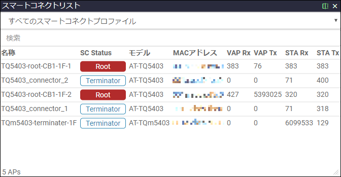 | 検索 | 無線APの検索(絞り込み)を行えます。 文字列を入力すると、現在の表示対象のうち、「SC Status」「モデル」「MACアドレス」のいずれかが本フィールドに入力された文字列と一致する項目だけに絞り込まれます。 絞り込みを解除するには、本フィールドを空欄にします。 注:大文字小文字を区別しますのでご注意ください。 |