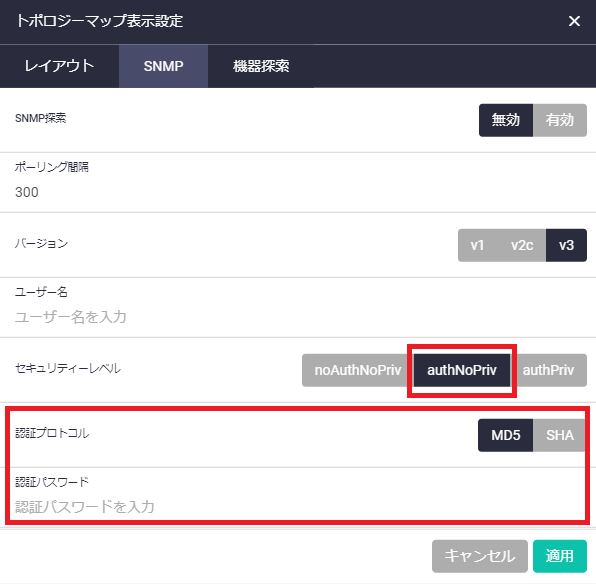 | authNoPriv | 認証パスワードあり、暗号化パスワードなし |