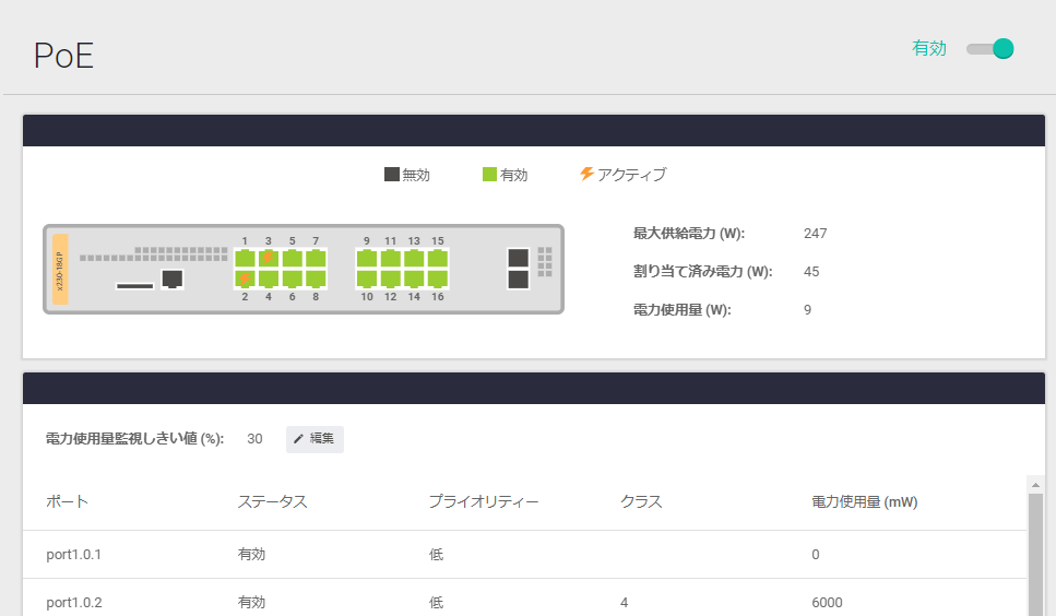 | 無効・有効スライドボタン | システム全体でPoE給電機能の無効・有効を切り替えます |
