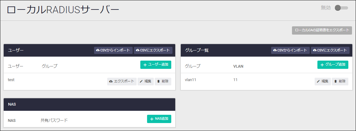 | 無効・有効スライドボタン | RADIUSサーバー機能の無効・有効を切り替えます |