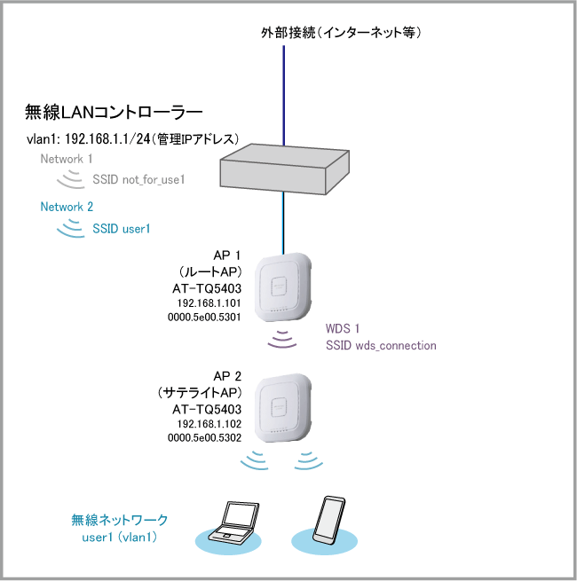 WDSでは、無線LANコントローラー管理下のネットワークに直接接続された無線APをルートAP、WDS接続を経由して無線LANコントローラー管理下のネットワークと通信を行う無線APをサテライトAPと呼びます。