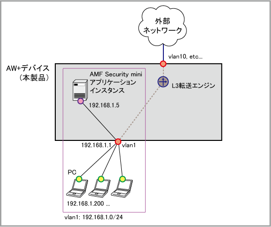 NoteAMF Security miniインスタンスは、次の概念図に示すように、「ホストインターフェース」で指定した本製品のインターフェースと同じネットワークに接続される形となりますので、「IPv4アドレス」には同ネットワーク内の使われていないIPアドレスと、同ネットワークのサブネットマスク長を指定してください。
