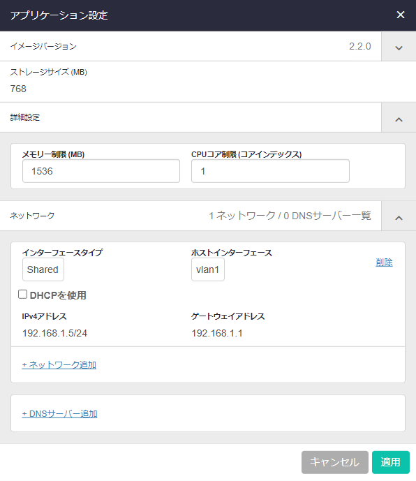Noteストレージサイズ (MB)、メモリー制限 (MB)、CPUコア制限 (コアインデックス)、インターフェースタイプ、「DHCPを使用」は、前表の「設定内容」に記載の値以外サポート対象外となります。