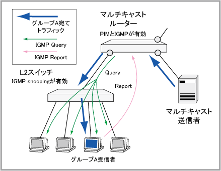 IGMP Snoopingは、VLAN環境において不要なマルチキャストトラフィックをフィルタリングする機能です(IGMPv1/v2/v3対応)。
