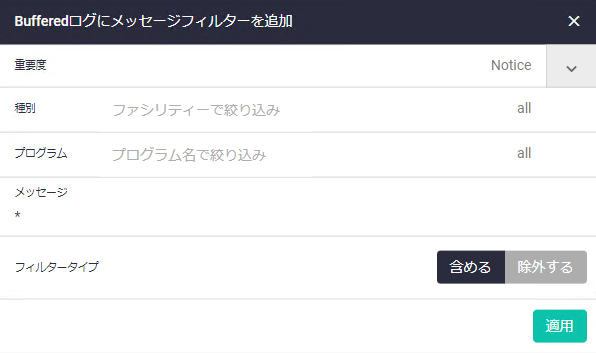 | 適用ボタン | 入力または選択したパラメーターをランニングコンフィグに反映して表示画面に戻ります。 未入力のパラメーターは薄い色で表示されている現在値のまま変更されません。 また、本ダイアログで変更した内容は、設定を保存して再起動するまで実際の動作には反映されません |
