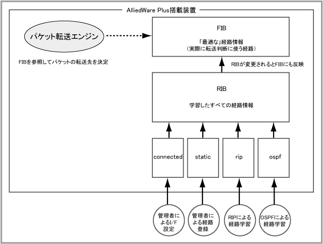 RIB(Routing Information Base:IP経路表)は、各種情報源から得た経路情報を蓄積するデータベースです。RIBには、管理者の手動設定や経路制御プロトコルによって学習された経路が原則としてすべて登録されます。RIBに経路が登録されるのは、次のときです。