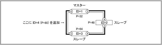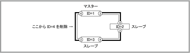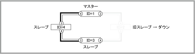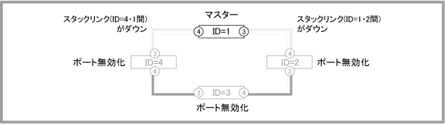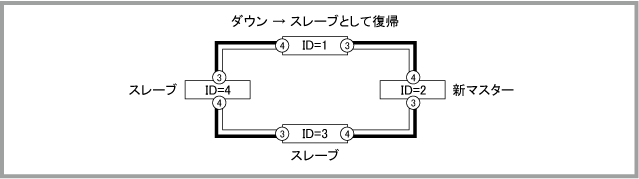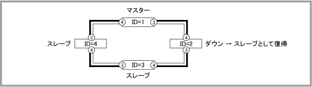 Noteマスター(ID=1)の正常起動後にポートがリンクアップして通信が可能な状態になりますが、通信が復旧するまでの時間は、ネットワーク環境と使用しているプロトコルの復旧時間に依存します。マスター(ID=1)は正常起動するまでポートをリンクアップしません。旧マスター(ID=2)も再起動中はリンクダウンするため、マスター(ID=1)がコンフィグを読み込んでから正常起動するまでの間、一時的にVCSグループの全ポートがリンクダウンしている状態になります。