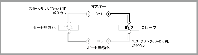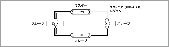 Noteマスター(ID=1)の正常起動後にポートがリンクアップして通信が可能な状態になりますが、通信が復旧するまでの時間は、ネットワーク環境と使用しているプロトコルの復旧時間に依存します。マスター(ID=1)は正常起動するまでポートをリンクアップしません。旧マスター(ID=2)も再起動中はリンクダウンするため、マスター(ID=1)がコンフィグを読み込んでから正常起動するまでの間、一時的にVCSグループの全ポートがリンクダウンしている状態になります。
