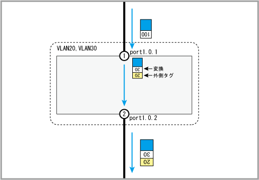これにより、ポート1.1.1から入ってきたVID100のタグ付きパケットは、VID30に書き換えられ、外側タグVID20が付加されます。