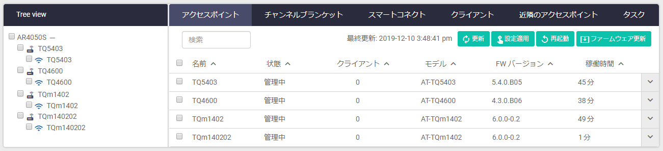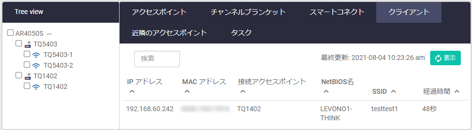 Note無線クライアント情報を表示させるには「表示」ボタンを押してください。なお、本ページで表示される情報は管理下アクセスポイントからクライアント接続情報に更新があるごとに送られてきます。