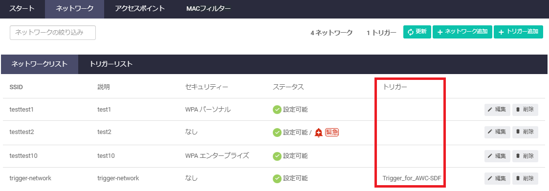 | トリガー | 対象無線ネットワークに関連付ける無線トリガーを指定。無線トリガーを関連付けた無線ネットワークは、トリガーが有効化されたときだけ有効になる |