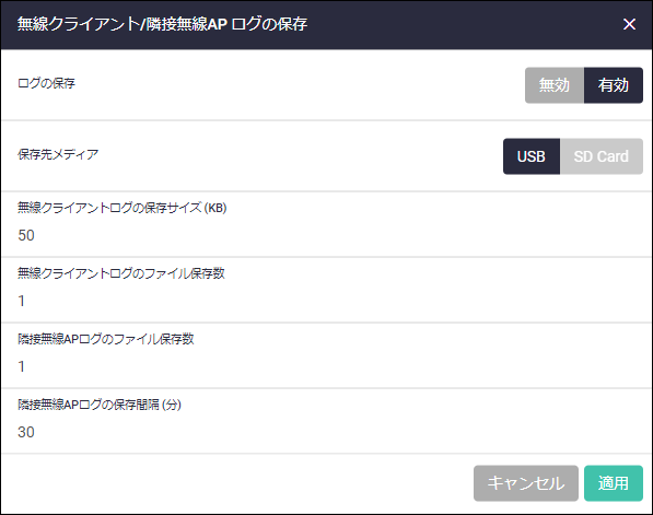 | ログの保存 | 無線クライアント・隣接無線APログ機能の無効・有効を切り替えます |
