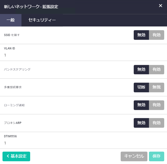 | クライアント隔離 | 対象無線インターフェースにおいて、無線クライアント間の通信遮断を有効/無効にする |
