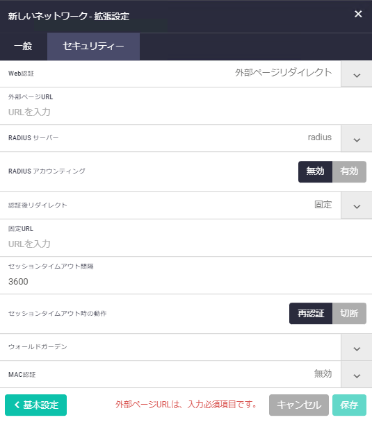 | セキュリティー | 対象無線ネットワークで使用するセキュリティー設定(なし、WPAパーソナル、WPAエンタープライズ、OSEN)を指定 |