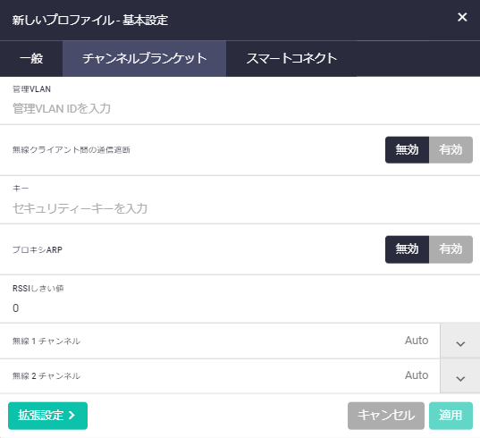 Note「新しいプロファイル - 基本設定」ダイアログでは、一般、チャンネルブランケット、スマートコネクトのタブが選択できます。SNMPエージェント機能の設定はCLIから行ってください。