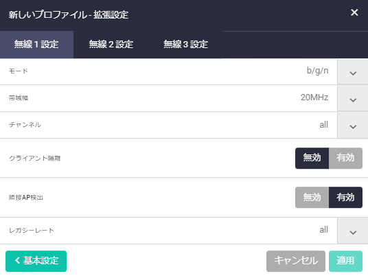 | 無線3 | 対象APプロファイルにおいて、無線3を有効/無効にする。またVAPで使用するSSIDの選択を行う |