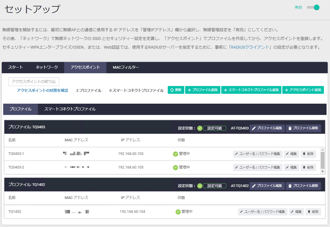 Note以下の条件に当てはまる場合、どれか1つのAPでも異なるAPプロファイルに変更すると、残りのAPの設定状態も変更有となります。
