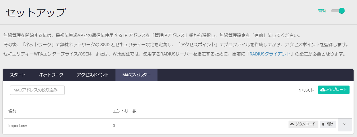 NoteCSVファイルをアップロードするごとにMACフィルターリストが作成されます。また、CSVファイル名がリスト名になります。