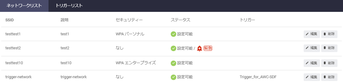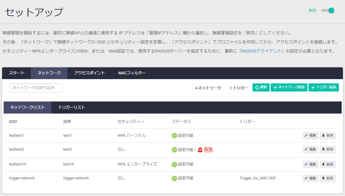 Note緊急モード機能と無線トリガー機能を両方有効にしたい場合は、一方の機能を有効にした後、対象APが管理下に入ったことを確認してから、もう一方の機能を有効にしてください。