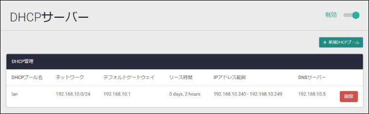 | 削除ボタン | DHCPプールを削除します。削除前には確認のダイアログが表示されます |