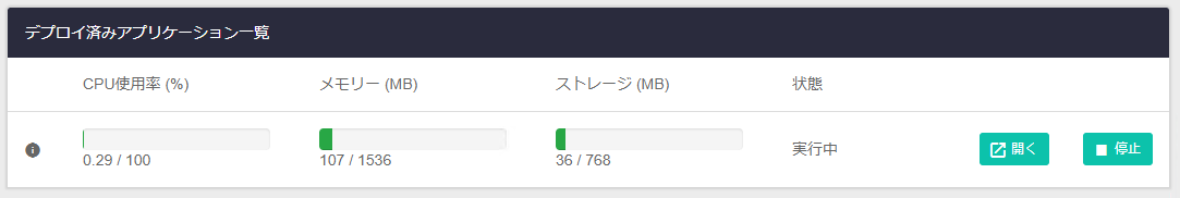 | 開く/削除ボタン | インスタンス実行中は「開く」ボタン、オフライン時は「削除」ボタンになります。「開く」はインスタンスのWeb画面を別ウィンドウで開き、「削除」はインスタンスの削除を行います |