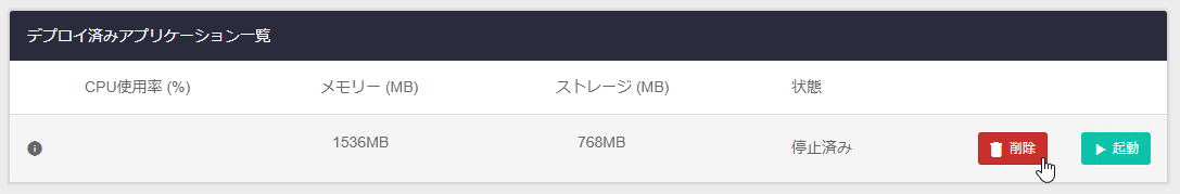 | 停止/起動ボタン | インスタンス実行中は「停止」ボタン、オフライン時は「起動」ボタンとなり、それぞれインスタンスの停止、起動を行います。 |