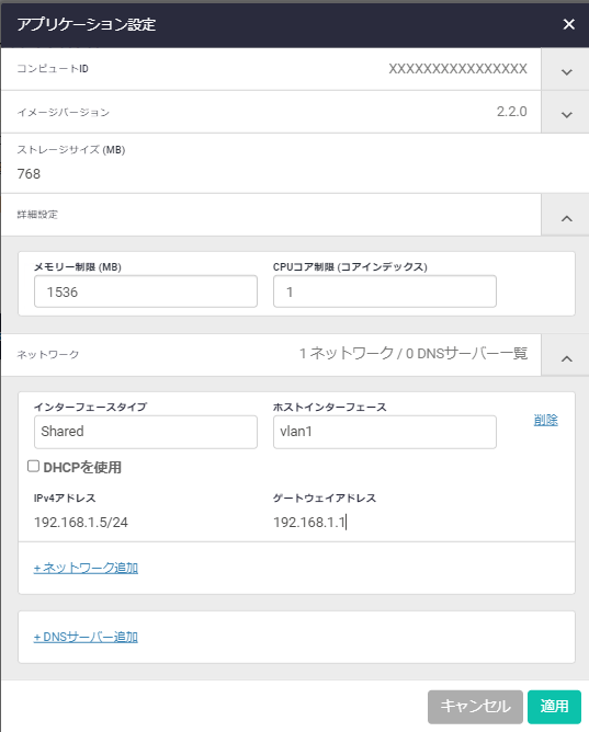 | DNSサーバー | DNSサーバーのIPアドレスを入力 | 未指定 |