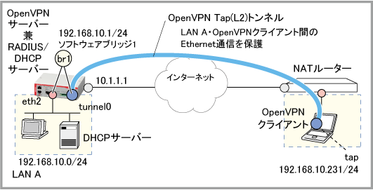 NoteAndroid版およびiOS版クライアントではTap(L2)モードでのOpenVPN接続が未サポートのため、本構成は使用できません。
