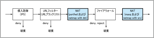 ■ portfwd および netmap with dst アクションのNATルールは、下記の順序でファイアウォールルールの処理前に適用されます。