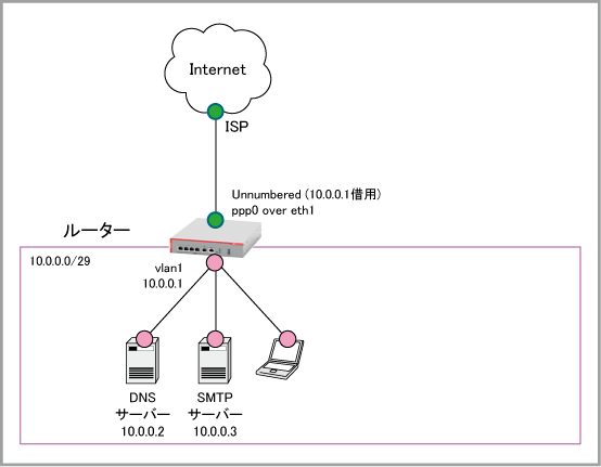 ISPから割り当てられているアドレス(10.0.0.0/29)は8個(10.0.0.0~10.0.0.7)ですが、ネットワークアドレス(10.0.0.0)、ブロードキャストアドレス(10.0.0.7)、ルーター自身のvlan1アドレス(10.0.0.1)にそれぞれ1個ずつ消費されるため、端末に設定できるアドレスは10.0.0.2 ~ 10.0.0.6の5個となります。