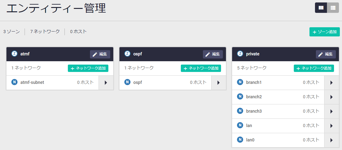 | x ゾーン | y ネットワーク | z ホスト | 定義済みのゾーン数(x)、ネットワーク数(y)、ホスト数(z)が表示されます |