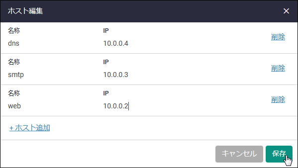 | ホスト追加 | ホスト情報の入力欄(「名称」と「IP」)を追加します |