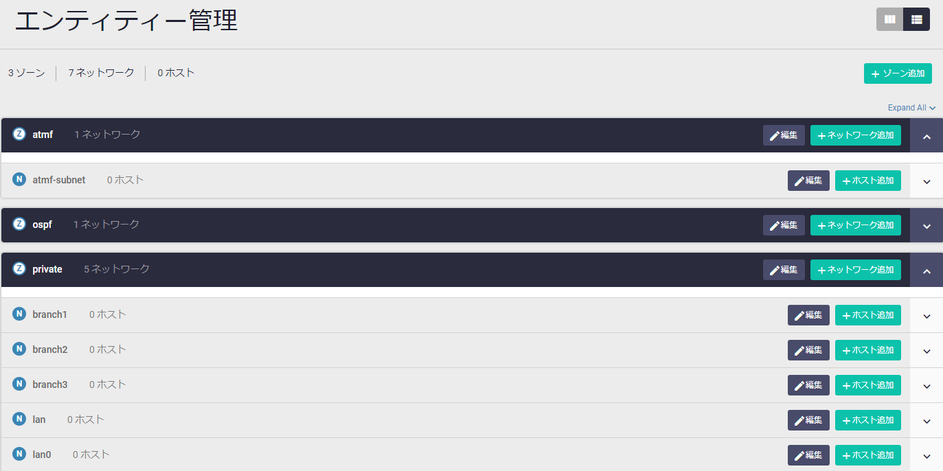 | Expand All ∨ | リストの全項目を展開し、ゾーン>ネットワーク>ホストのすべての階層が表示された状態にします |