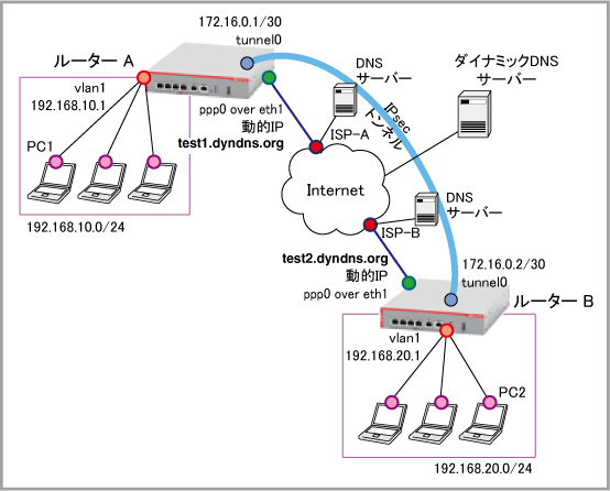 NoteルーターA、Bが使用するホスト名やダイナミックDNSサーバーにアクセスするためのアカウントは、あらかじめ取得してあるものとします。