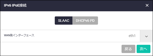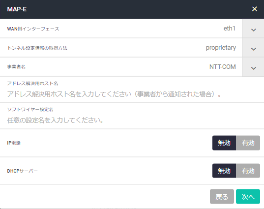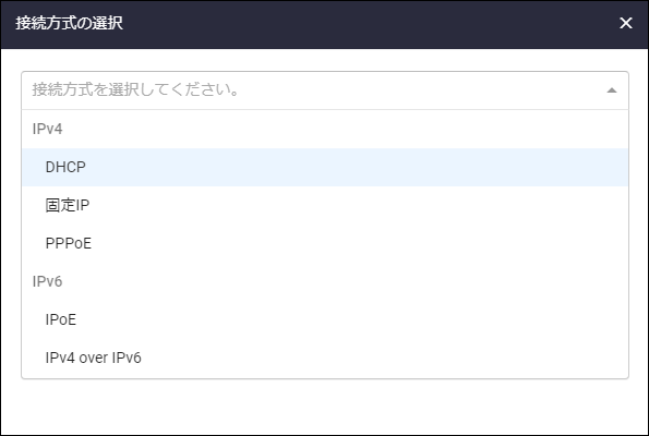 | 設定取得方式を下記から選択してください。 ・dhcp(DHCPv6サーバーから取得) ・proprietary(事業者の独自方式。別途事業者名を指定) ・static(静的方式) |