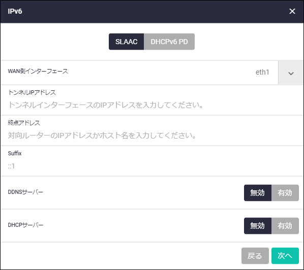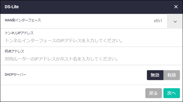 | トンネルインターフェースから送信するデリバリーパケットの終点(対向装置:事業者側ルーター(AFTR))アドレスを入力してください。 | |