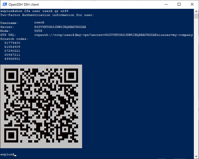awplus# 2fa create user userA random-secret ↓