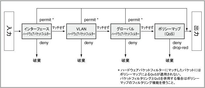 Noteハードウェアパケットフィルターにマッチしたパケットに対して、ポリシーマップによるQoSは適用されません(ここでの「マッチ」とは、破棄(deny)だけでなく明示的な転送許可(permitなど)も含みます)。ハードウェアパケットフィルターで破棄(deny)のアクションだけを使用する場合は両者を併用しても問題はありませんが、ハードウェアパケットフィルターで破棄以外のアクションを使用する場合は、ハードウェアパケットフィルターとポリシーマップを併用せずに、ポリシーマップのフィルタリング機能を使ってフィルタリングを行ってください。