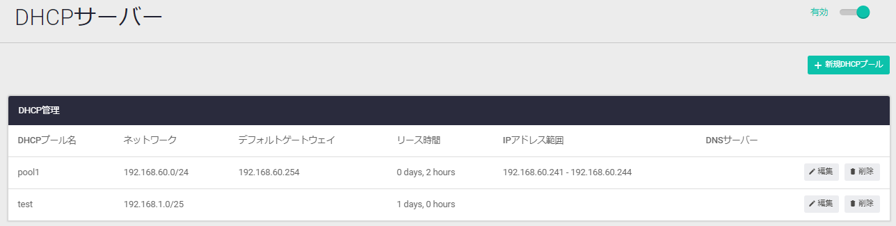 | 新規DHCPプールボタン | 新規DHCPプールダイアログが開きます |