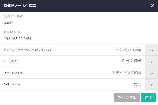 | 適用ボタン | 新規DHCPプールを変更して一覧画面に戻ります |
