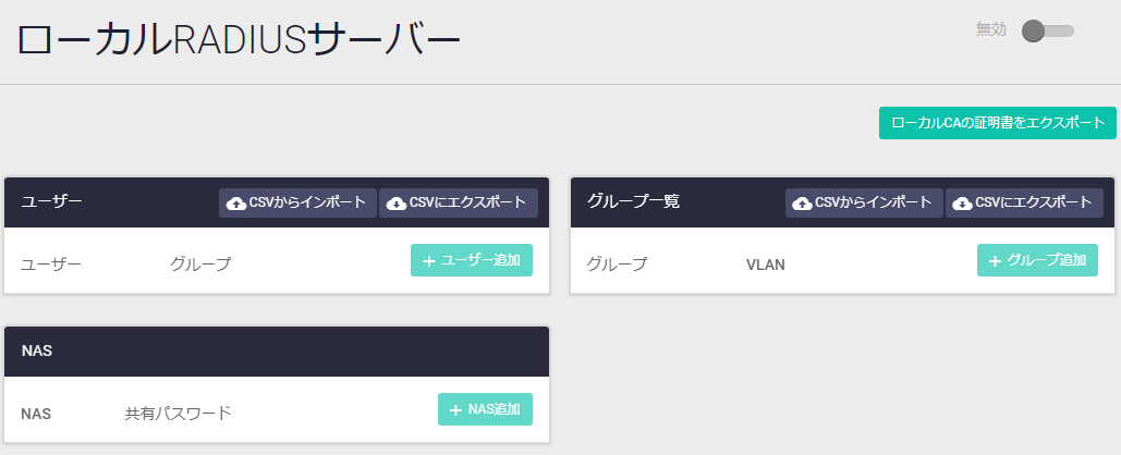 | 無効・有効スライドボタン | RADIUSサーバー機能の無効・有効を切り替えます |