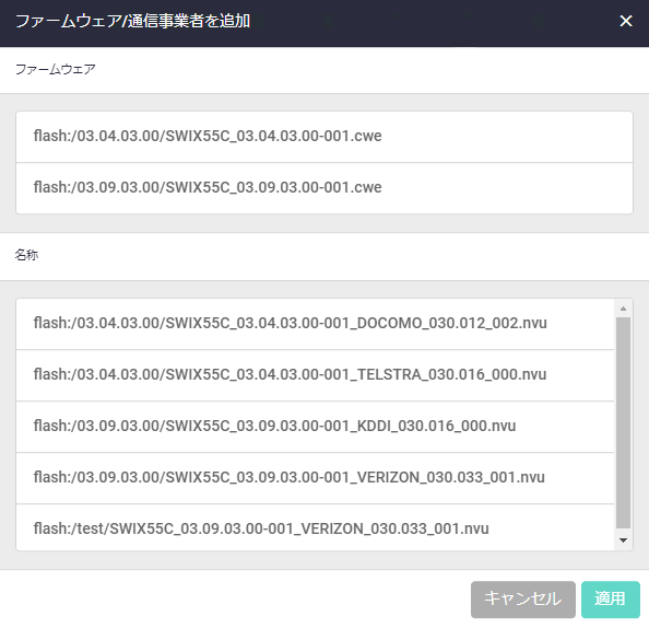 | 適用ボタン | ファームウェアと通信事業者設定(PRIファイル)を追加してCarriers画面に戻ります |