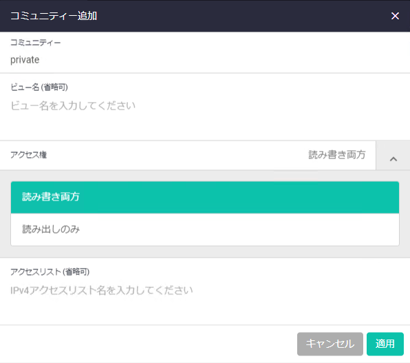 | アクセス権 | コミュニティーのアクセス権を「読み書き両方」、「読み出しのみ」から選択してください |