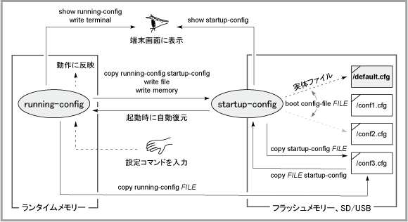 copy running-config startup-config」の書式で実行するたびにflash:/default.cfgが書き換えられます。また、erase startup-configコマンドを実行するとflash:/default.cfgが削除されます。Note初期設定の実体ファイルである「flash:/default.cfg」は、直接的なファイル操作が行えないよう保護されています。たとえば、copyコマンドのコピー先に指定して上書きコピーしようとしたり、deleteコマンドで削除しようとしたり、moveコマンドで移動・リネームしようとしたりすると、「Cannot overwrite flash:/default.cfg as it is the default config file」というエラーになります。