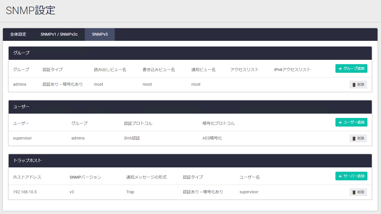 | 通知ビュー名 | グループ所属ユーザーが受け取れる通知MIBオブジェクトの範囲を示すビューの名前が表示されます |