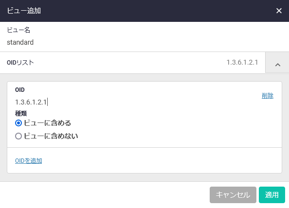 | OIDリスト | ビューを構成するOIDエントリーの一覧が表示されます。OIDエントリーを追加するには、右側の下向き矢印をクリックして「+ OIDを追加」をクリックし、ベースとなるOIDとエントリーの種類(含める=アクセスを許可、含めない=アクセスを拒否)を指定してください |