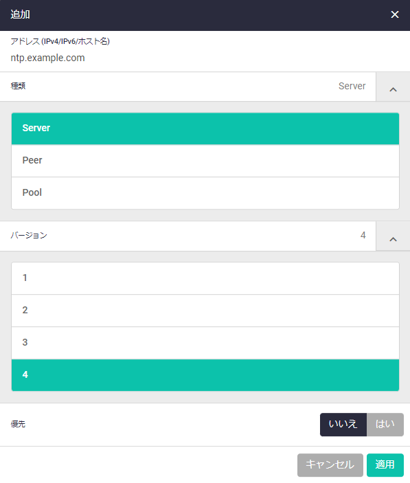 | 種類 | 同期先の種類をServer(NTPサーバー)、Peer(ピアを設定)、Pool(プールサーバー)から選択します |